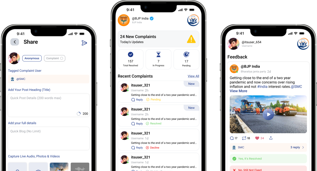 Citizens can post complaints, issues, or feedback with text, photo, or video directly from their phone.